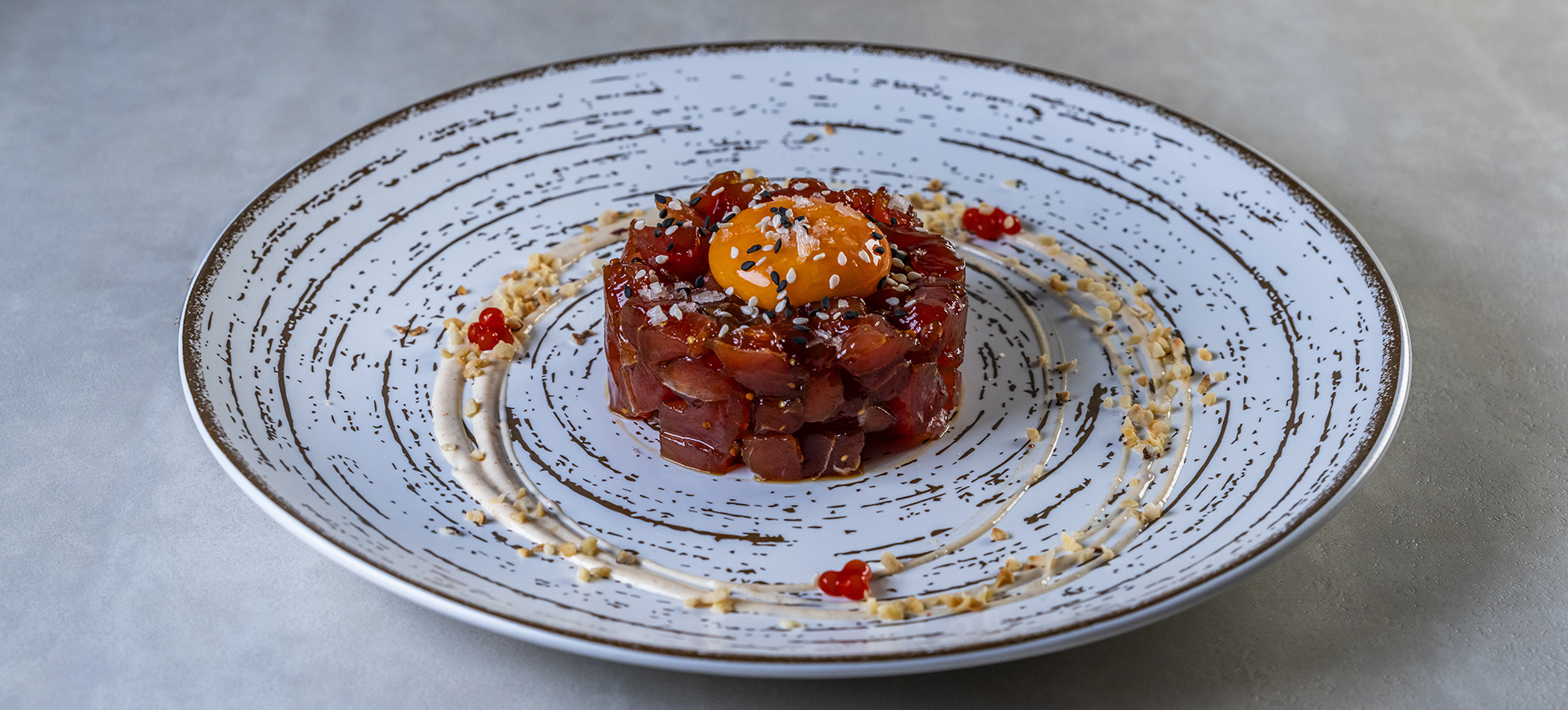 Tartar de atún marinado con yema de huevo de caserio